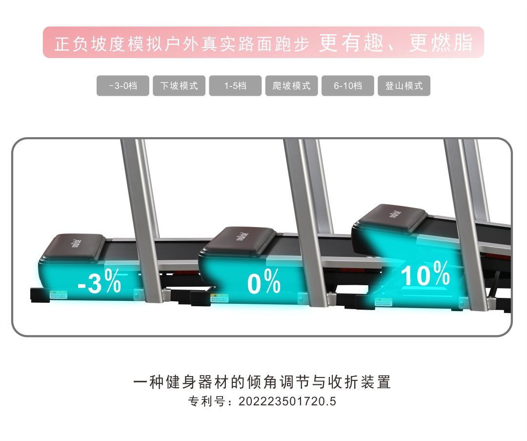 显示参数:时间,速度,距离,卡路里,坡度(正&负坡度),心率,步数;