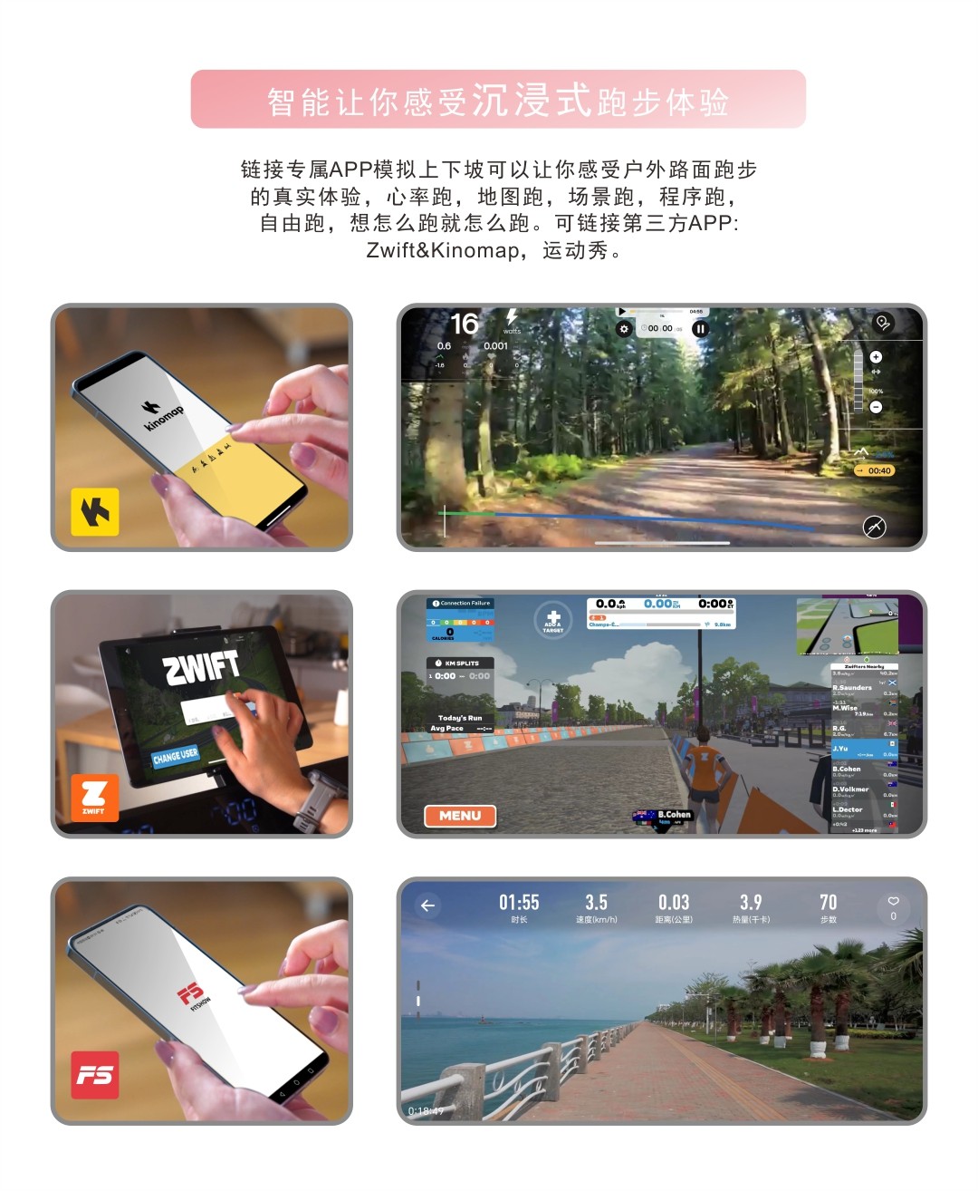 蓝牙设备:可支持连接FITSHOW, ZWIFT, KINOMAP;